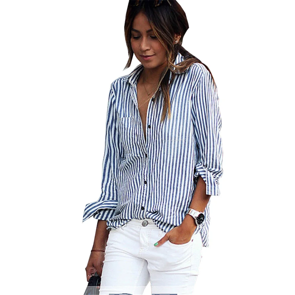 استعارات ل جديد أزياء كبير حجم 2018 مثير مخصص اللون عارضة الصيف قميص مخطط طويل الأكمام قميص blusa الإناث المرأة TN11