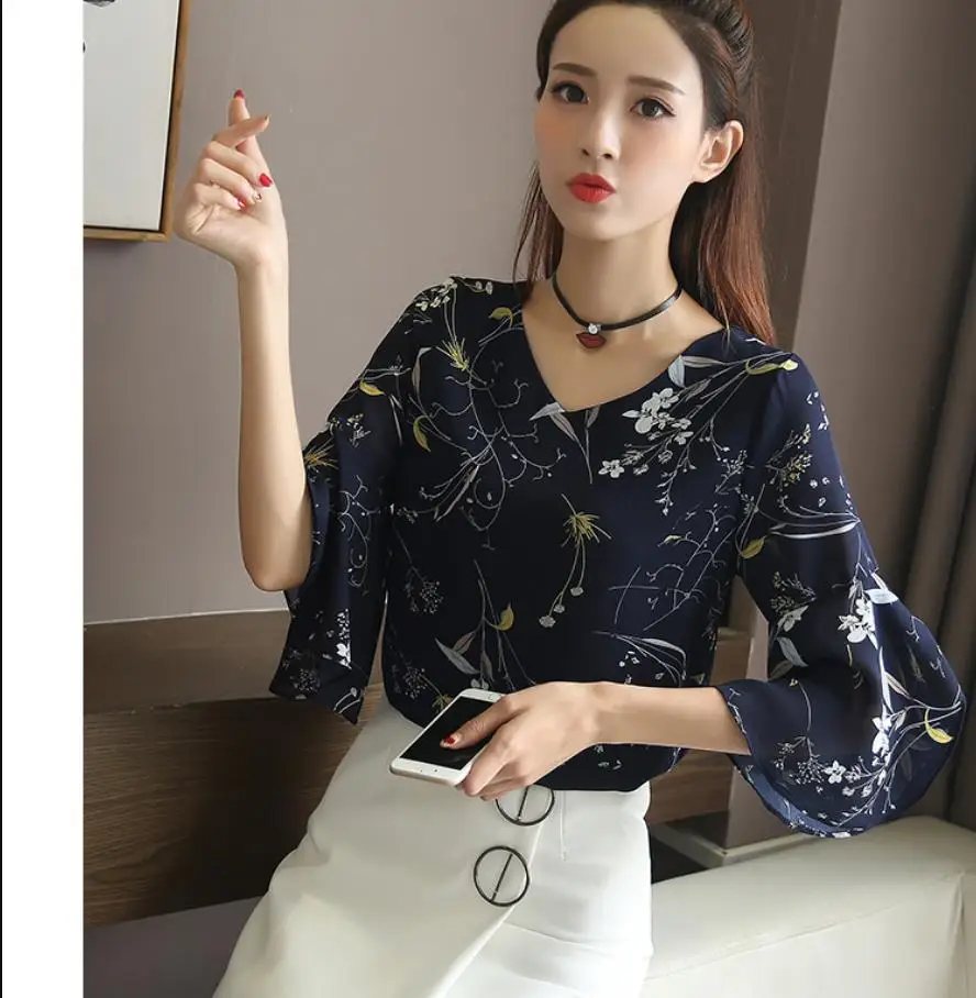 المنتجات ذات الصلة ل Shirts و 2019 الصيف بلوزة قميص الأزهار الشيفون قميص البرية البوق كم أعلى النساء فضفاضة رقيقة كم الشيفون قميص 201914