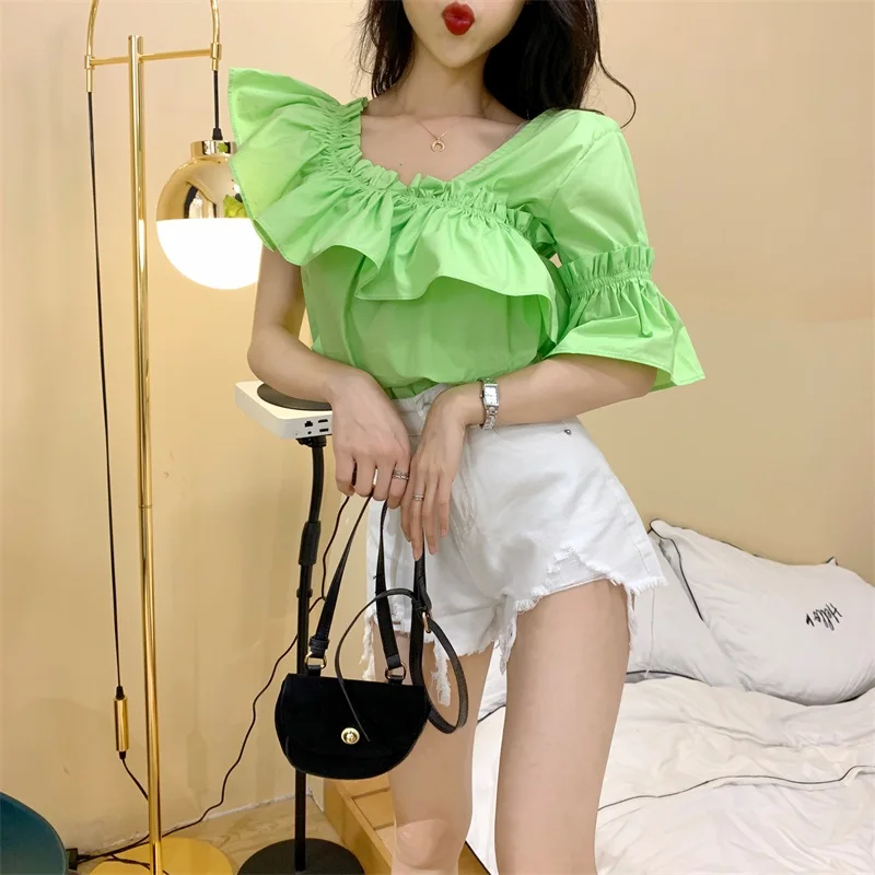 استعارات من الصيف الجديدة 2019 الكورية قصيرة الأكمام قميص فضفاض البرية غير النظامية مثير بلوزة أنيقة الإناث مزاجه شيك قمصان امرأة SP449