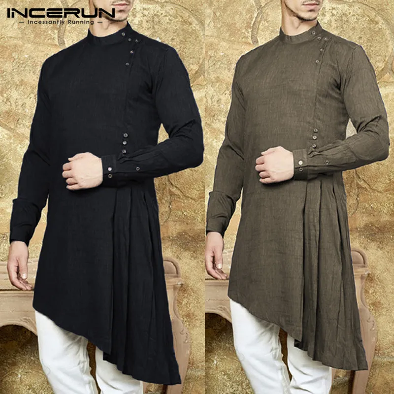 معرض ل الرجال قميص الهندي كورتا دعوى بلون طويلة الأكمام القطن عارضة قمم الرجال الإسلامية مسلم العربية قفطان الرجال طويلة قميص 3XL INCERUN