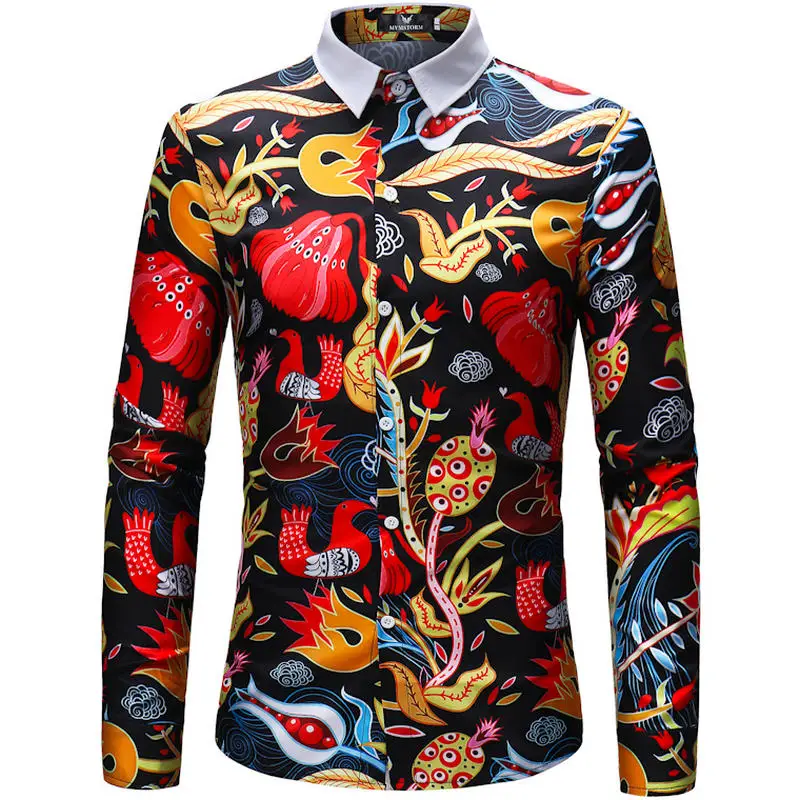 البحث عن معلوماتمعلومات اضافية 2018 الرجعية الأزهار المطبوعة الرجال اللباس قميص رجل عارضة الأزياء الكلاسيكية تنفس الرجال طويلة الأكمام ماركة الملابس
