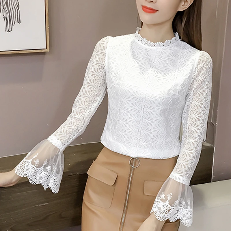 المنتجات ذات الصلة ل Shirts و 2019 الأزياء الدانتيل الأبيض بلوزة قميص المرأة بلوزات على الموضة جولة الرقبة مضيئة كم الإناث البلوزات الخريف الجوف خارج قمم 804H3