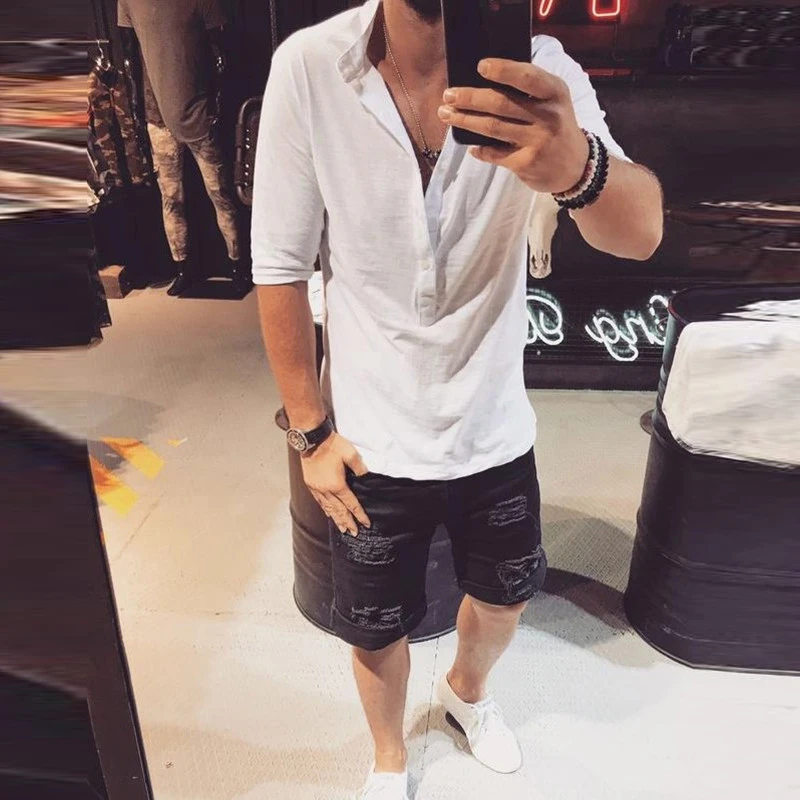 صور من 2019 الأزياء قميص الرجال هينلي قمصان الخامس الرقبة نصف كم صالح سليم Camisa هومبر عطلة الشاطئ قميص قميص الخريف الرجال الملابس
