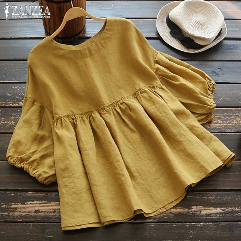 وانت con motivo deشراء Shirts, luego أزياء كشكش بلوزة الصيف المرأة تونك 2019 ZANZEA خمر عارضة الكتان قمم الإناث 3/4 فانوس كم Blusas مطوي قمصان tal vez ganar appeal