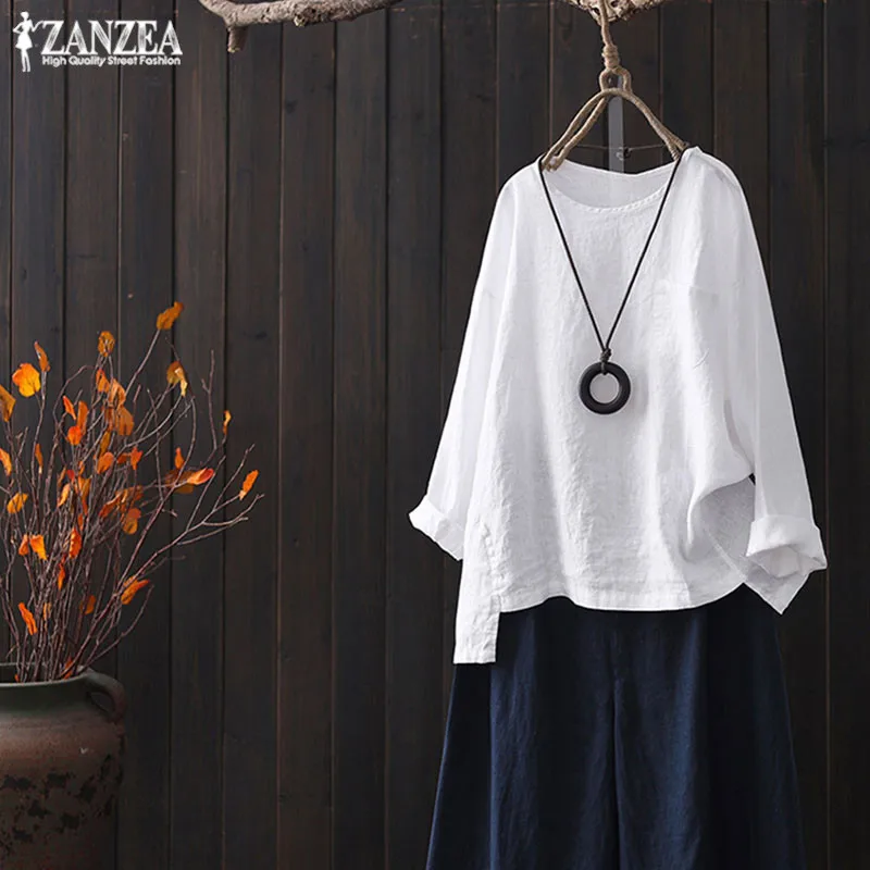 استعارات من 2019 زائد حجم ZANZEA الربيع النساء Casaul يا الرقبة كم طويل قمصان قمم خمر الصلبة القطن الكتان حزب فضفاض بلوزة الإناث