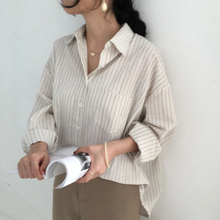 صور من الفتيات مخطط النساء البلوزات المتناثرة قمصان طويلة الأكمام رفض طوق قمم الإناث البلوزات الربيع قمصان 2019