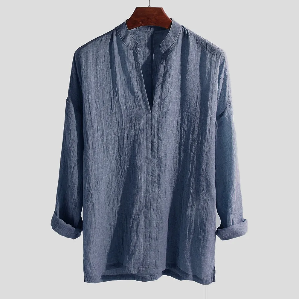 استعارات ل السببية قميص رجالي الصيف تنفس طويلة الأكمام فضفاضة الذكور بلوزة الأزياء الصلبة اللون الخامس الرقبة أعلى ملابس للرجال قميص أوم
