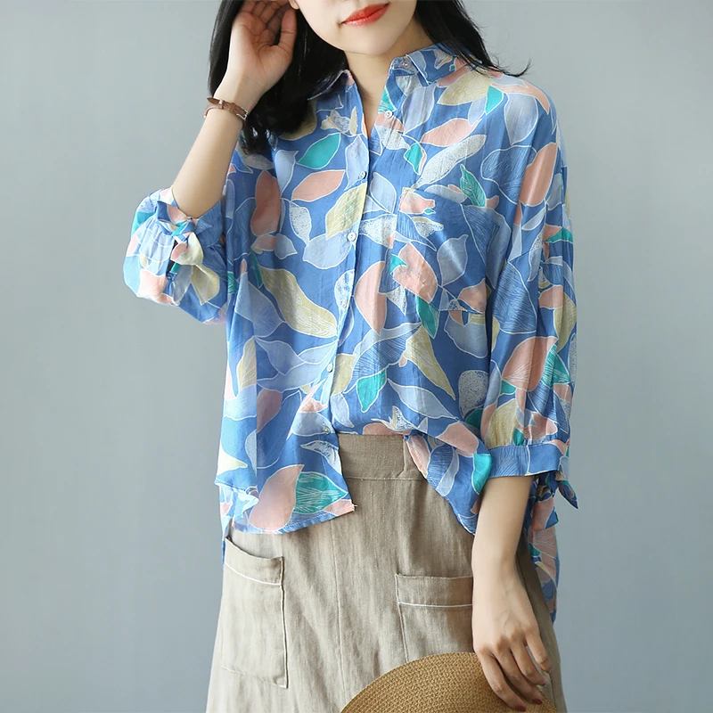 المنتجات ذات الصلة ل Shirts و شخصية اللون ورقة طباعة ثلاثة أرباع كم قميص الصيف بلوزة الإناث