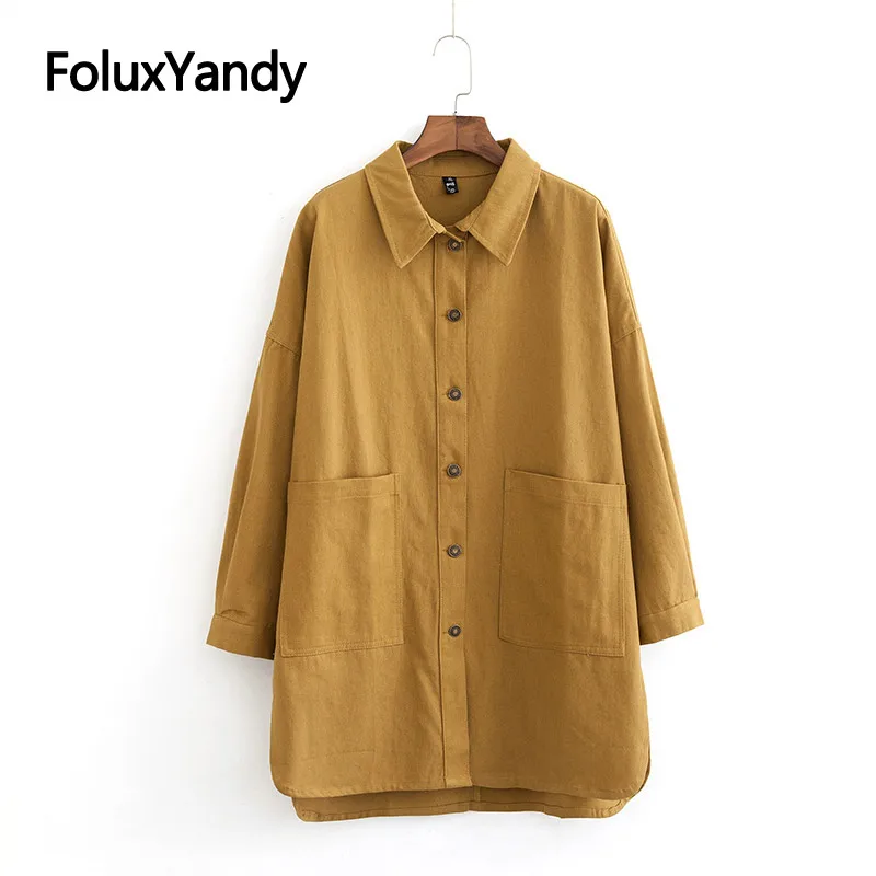 المنتجات ذات الصلة ل Shirts و زائد حجم خمر البلوزات المرأة الربيع الخريف فضفاض قطرة الكتف طويلة الأكمام بلوزة قميص جيوب Blusa KKFY3127