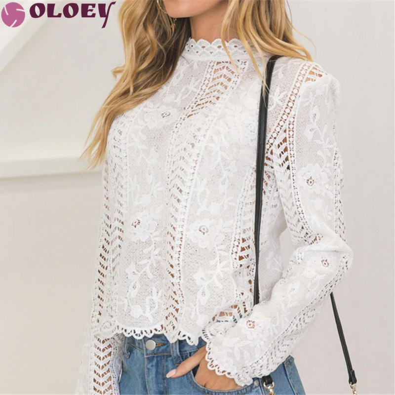 شراءمعلومات اضافية الصيف الدانتيل الأبيض بلوزة المرأة الجوف طويل كم الياقة المدورة شفافة قمم النساء قمصان Blusas موهير دي مودا