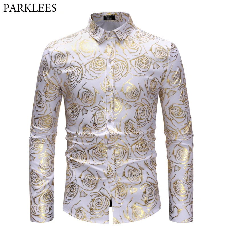 وانت porأرغب في شراء Shirts, luego لامعة وردة ذهبية طباعة الأبيض الرجال قميص طويل كم يتأهل الأزهار رجل اللباس قمصان حزب عارضة حفلة موسيقية الذكور قميص الاجتماعي camisas tal vez hacer interest
