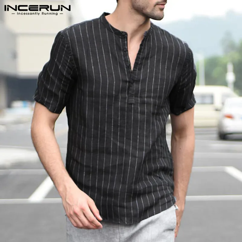 أرغب في شراءمعلومات اضافية INCERUN عارضة رجل قميص شريطية قصيرة الأكمام زر ضئيلة القطن قميص موقف طوق السترة الأزياء الاجتماعية قمم الرجال S-3XL 2019