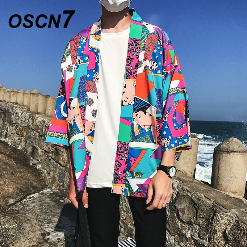 استعارات من OSCN7 المطبوعة كيمونو سترة قميص الرجال الشارع 2019 كوريا كم الربع الثالث معطف قمصان Harujuku رجل قميص 8805