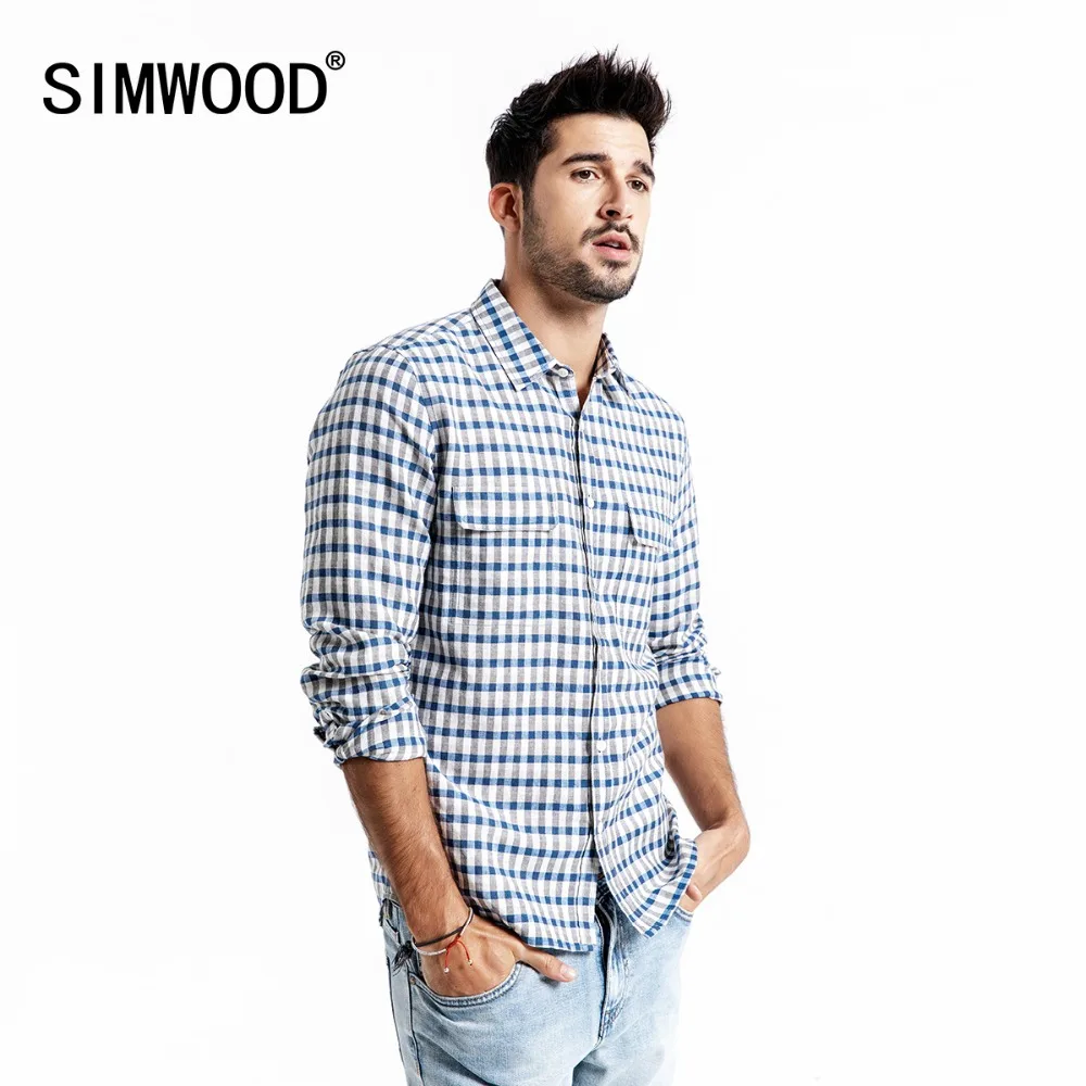 شراءمعلومات اضافية SIMWOOD عارضة قميص الرجال العلامة التجارية الكتان 2019 الخريف أزياء الشارع الشهير كم طويل قمصان مربعة النقش الذكور Camisa الغمد 190174