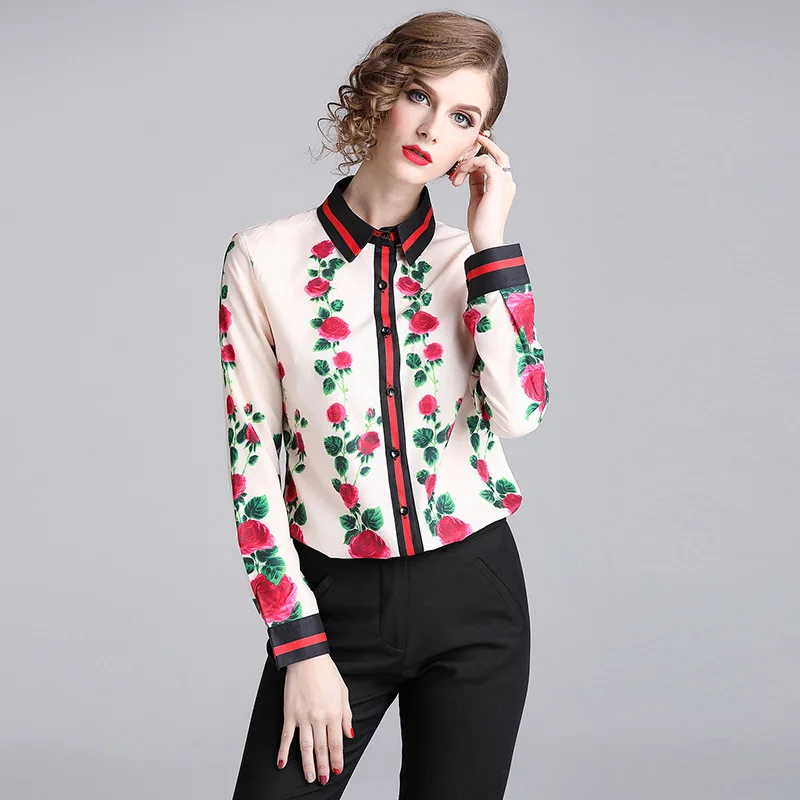معرض من 2019 جديد كامل الأكمام عارضة رواج الشيفون طباعة قميص الربيع الصيف ضئيلة مزاجه بلوزة ملابس نسائية A10-32
