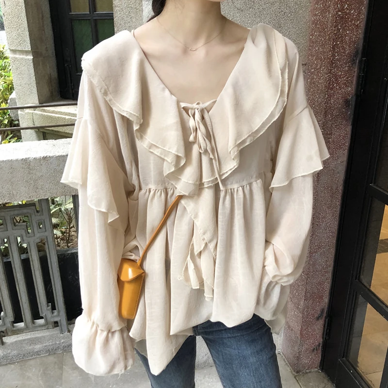 استعارات ل الربيع 2019 جديد الكورية الحلو طويل الأكمام الإناث الخامس الرقبة قميص فضفاض الشيفون قمصان أنيقة النساء قمصان