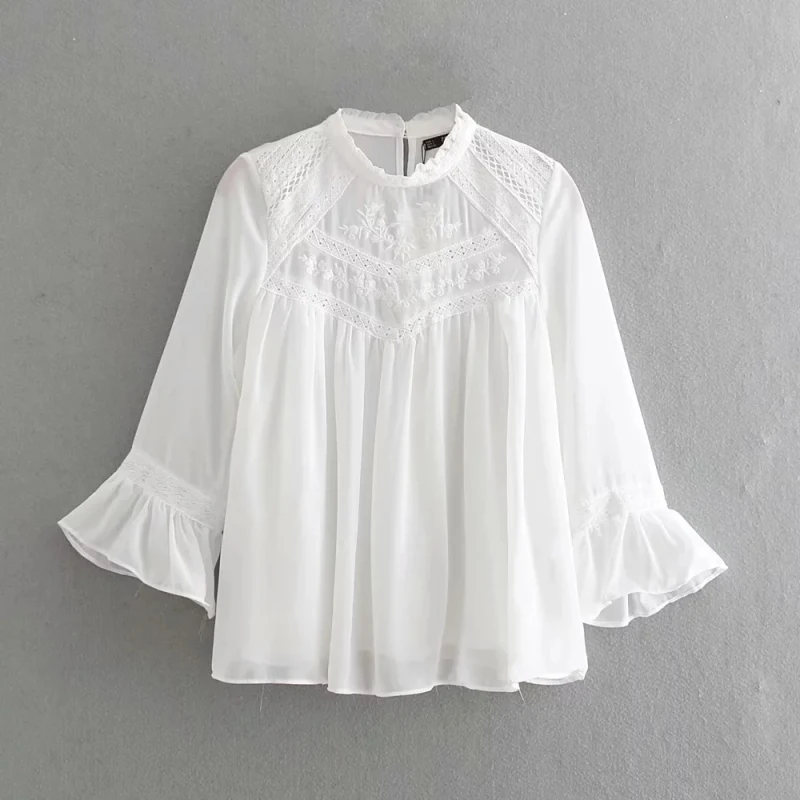 المنتجات ذات الصلة ل Shirts و النساء الدانتيل الأبيض البلوزات 2019 الصيف تي شيرتات قطن الجوف خارج الزهور التطريز قميص الصلبة الفتيات شيك البتلة كم قمم فام