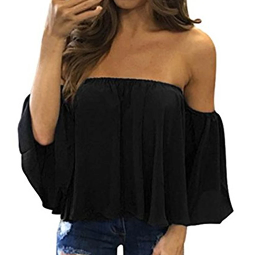 وانت paraشراء Shirts, luego أنيق إمرأة معطلة الكتف عارضة بلوزة قميص قمم حمالة الصرفة اللون جرس النفخة الأكمام قمم es posible hacer appeal