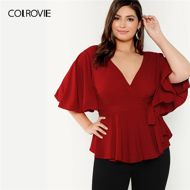 شراءمعلومات اضافية COLROVIE زائد حجم الأحمر V الرقبة رفرفة كم كشكش الرداء الكهنوتي التفاف عقدة أنيقة بلوزة قميص المرأة 2019 الصيف مكتب السيدات قمم