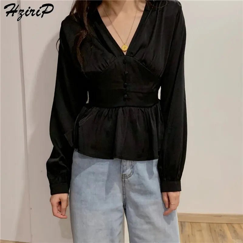 المنتجات ذات الصلة ل Shirts و Hzirip كوريا 2019 الصيف الحلو فضفاض عارضة الصلبة الكشكشة الإناث قصر نمط طويلة الأكمام الخامس الرقبة الطازجة الأزياء قمصان 4 ألوان