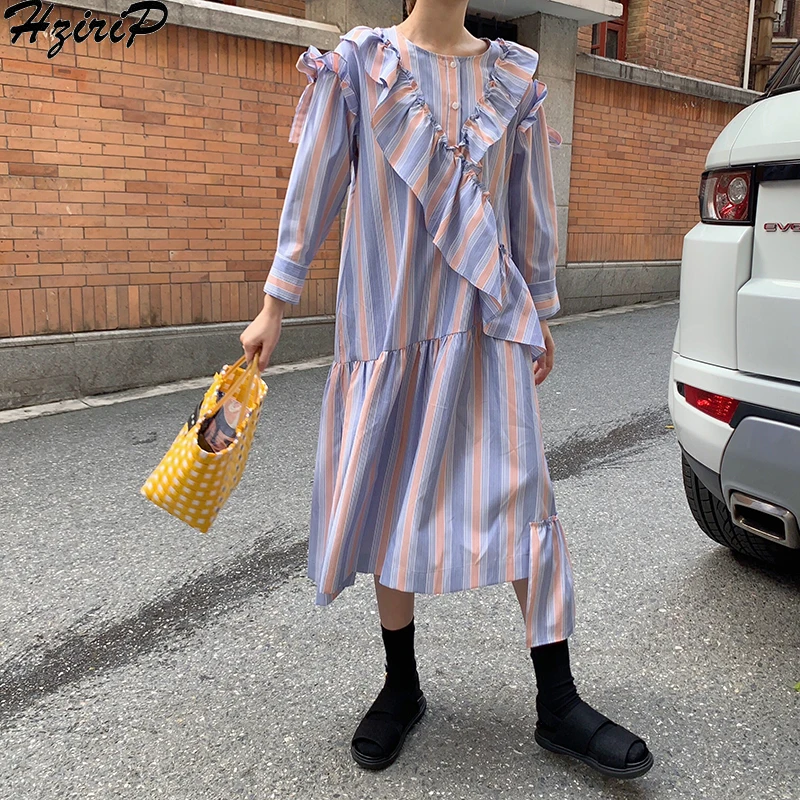 معرض ل HziriP جديد خمر 2019 الربيع الصيف قميص مكتب أنيقة س الرقبة النساء مخطط أنيقة السيدات منتصف العجل Preppy نمط بلوزة