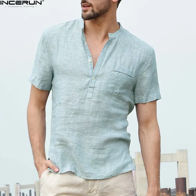 أرغب في شراءمعلومات اضافية INCERUN الصيف قصيرة الأكمام قميص الرجال العلامة التجارية أزياء الرجال قمصان الكتان الوقوف طوق السماء الزرقاء قميص رجل قميص Camisas الغمد
