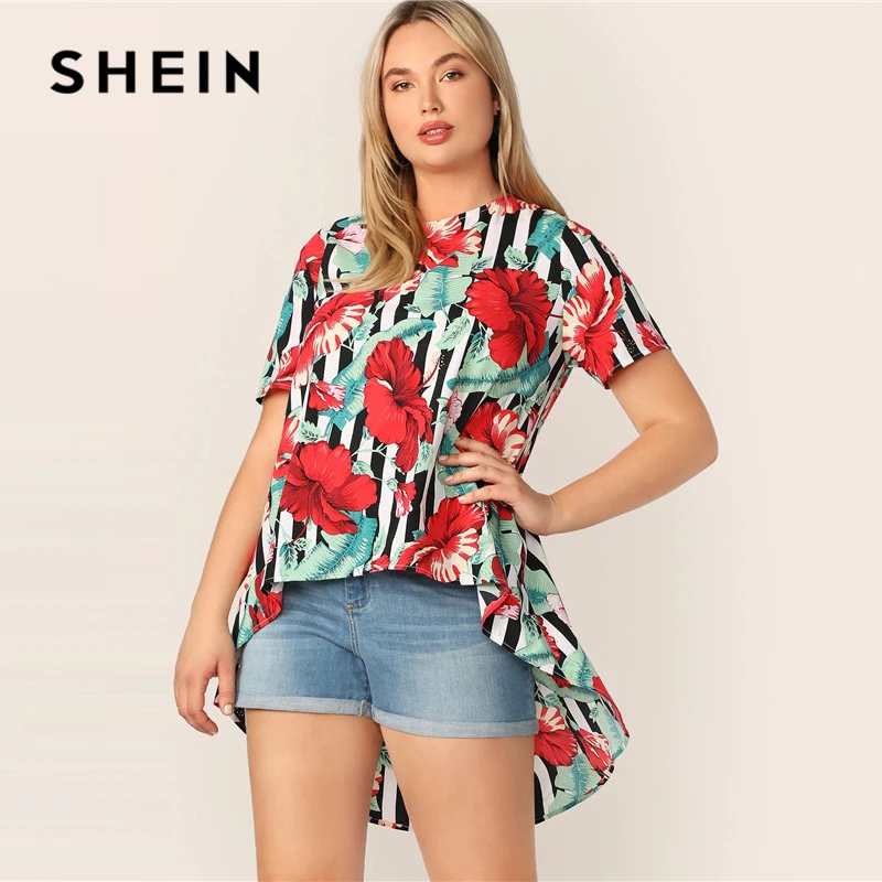 المنتجات ذات الصلة ل Shirts و SHEIN زائد حجم متعدد الألوان غير المتكافئة تنحنح الاستوائية و شريط طباعة بلوزة 2019 الصيف بوهو الأزهار الخيوط الطويلة البلوزات قميص