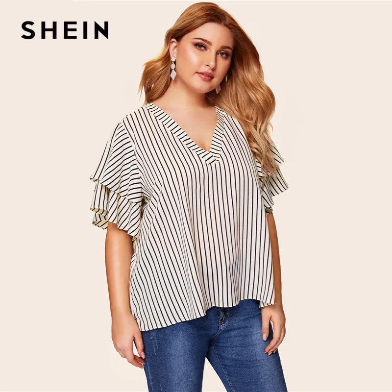 أرغب في شراءمعلومات اضافية SHEIN زائد حجم الأبيض V الرقبة طبقتين كم مخطط بلوزة المرأة الصيف عارضة جولة الرقبة فراشة كم البلوزات قميص
