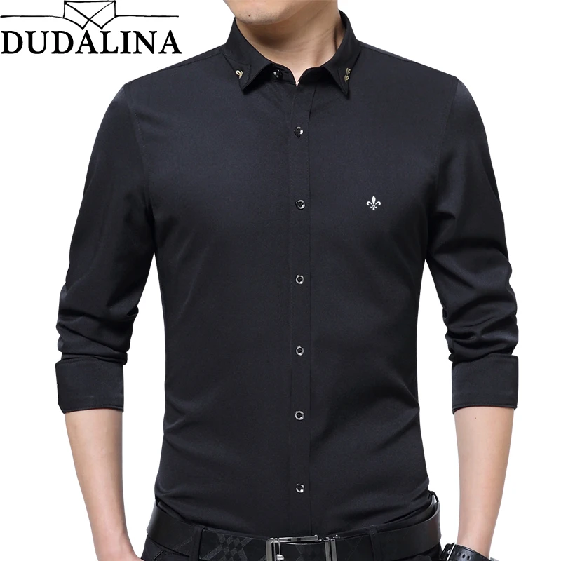 صور من DUDALINA التطريز الرجال الملابس الصلبة ملابس رجالي تلائم الرجل النحيف طويل كم قميص عارضة الرجال الاجتماعية قميص زائد حجم المضادة للتجاعيد خالية...